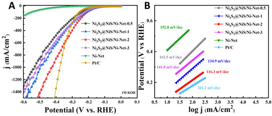 2.3. Electrochemical Evaluation of Ni3S2@NiS/Ni-Net for the HER