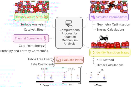 The periodic DFT-based calculations supporting the current work on the selective oxidation of ethane over the M1 phase of the MoVNbTeO formulation were performed in a prior study [5]. That research focused on identifying the active sites at the atomistic scale involved in the oxidative dehydrogenation of ethane to produce ethylene and water, while simulating the intermediates to determine ground-state energies and geometries, including both initial and final states. Transition states along the reaction pathways were identified using the nudged elastic band (NEB) method or dimer calculations, enabling the estimation of energy barriers. For reactions with multiple competing pathways, Gibbs free energy calculations were applied to identify the most thermodynamically and kinetically favorable routes. Additionally, thermal properties, such as zero-point energy corrections as well as entropic and enthalpic contributions, were calculated through frequency analysis to improve thermodynamic corrections and enhance the reliability of the proposed reaction mechanism. Thus, the reaction pathways and energy barriers determined in the prior study provided the foundation for extracting thermodynamic and kinetic parameters, including activation enthalpies, entropies, and rate coefficients, using transition-state theory. These parameters served as the basis for the kinetic modeling developed in the current work. Figure 1 presents the methodology used to carry out the DFT reaction mechanism analysis. For a comprehensive description of the computational approach and key results, readers are referred to our previous DFT-based study [5].