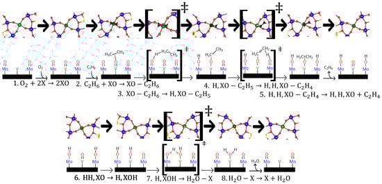 Accounting for the configuration shown in Figure 3, the active site is first conceptualized as X and is composed of the following set of atoms: Mo[O][]-V[O][]-Mo[O][]. Here, “[]” denotes a vacancy and “[O]” denotes a vacancy specifically occupied by oxygen. For instance, Mo[O][]-V[O][]-Mo[O][] is written as XO, and Mo[O][]-V[O][CH]-Mo[O][] is written as XO-CH. This conceptualization is intended to simplify the description of intermediate formation during the catalytic cycle. The application of this nomenclature to formulate a reaction mechanism is described in Figure 4, where the intermediates and transition states, as obtained from the ab initio calculations, are abstracted to formulate the elementary steps [5]. These elementary steps are listed in the reaction mechanism summarized in Table 1. This table presents the hypothesized elementary reaction steps along with the corresponding Horiuti analysis for the catalytic cycles. It is important to note that the complete oxidation pathway is described using a lumping scheme based on the Eley–Rideal formalism, as these steps proceed too rapidly once initiated as identified in a previous publication [4]. This approach for total oxidation requires further corroboration due to the lack of microscopic information regarding these reaction pathways for the MoVTeNbO formulation.