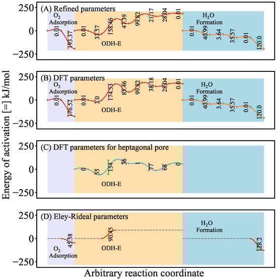 Activation energy profiles : (A) corrected parameters by regression, (B) obtained from DFT calculations over terminal surface oxygen [5], (C) obtained from DFT calculations over bridge oxygen in the heptagonal pore [13], and (D) Eley–Rideal formalism (black-box active site) [7].