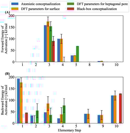 Comparison of energies of activation for refined parameters of atomistic approximation, DFT approximations, and black-box conceptualization: (A) for forward steps and (B) for backward steps.