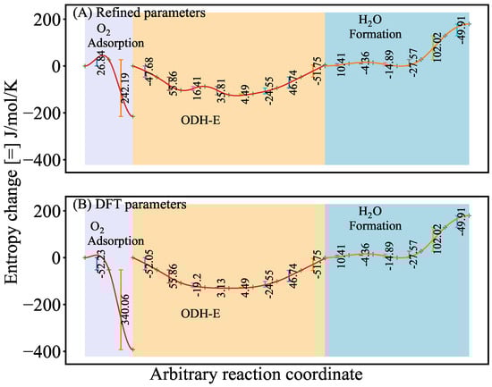 Similar results are identified with respect to the consistency of the initial values of the pre-exponential factors with those tuned by the regression analysis as observed when comparing the corresponding entropy change profiles, as shown in Figure 8. Note that, as in the case of activation energies, significant deviations are identified in the entropy change associated with the dissociative adsorption of surface oxygen, which is linked to the pre-exponential factors and . These pre-exponential factors have values of Pas and s, respectively, whose magnitude order indicates that the dissociation of oxygen occurs more frequently than predicted by DFT. For example, is adjusted to 1.75 times the DFT value, while is reduced to 0.84 times the DFT value. These corrections may be attributed to the lumping of surface total oxidation processes, which typically, at the elementary level, involve the associative adsorption of oxygen followed by dissociation [52,53]. Additionally, the remaining entropy changes are close to the values predicted by DFT, and their associated pre-exponential factors deviate by no more than 15% as shown in Table 5.