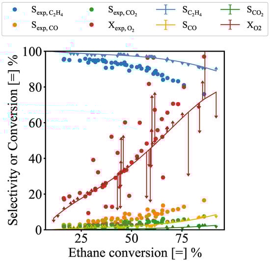 The regression analysis is conducted using the reactor model presented in Equation (5) to predict values under the experimental conditions. In Equation (5), represents the gas-phase concentration of species i, i.e., oxygen, ethane, ethylene, CO, CO, and water. is the catalyst density, is the volumetric flow rate, w is the catalyst mass, and is the rate of formation of gas-phase species. is computed as shown in Equation (6), where is calculated using Equation (1), and represents the stoichiometric coefficients for global reactions as presented in Table 1. The values of the fixed parameters for Equations (2), (3) and (5) are listed in Table 4.