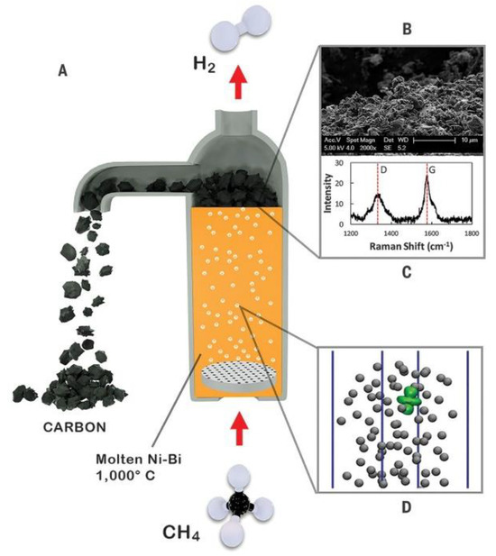 (A) Molten metal bubble reactor used for CH4 decomposition with continuous carbon separation. (B) SEM image of the produced carbon (C) Raman spectrum of the surface carbon. D line and G line correspond to 1350 cm−1 and 1582 cm−1, respectively. (D) Ab initio molecular dynamics simulation indicating an orbital (green) of a Pt atom dissolved in molten Bi (gray) alloy. Reprinted with permission from Ref. [48]. Copyright 2017 The American Association for the Advancement of Science.