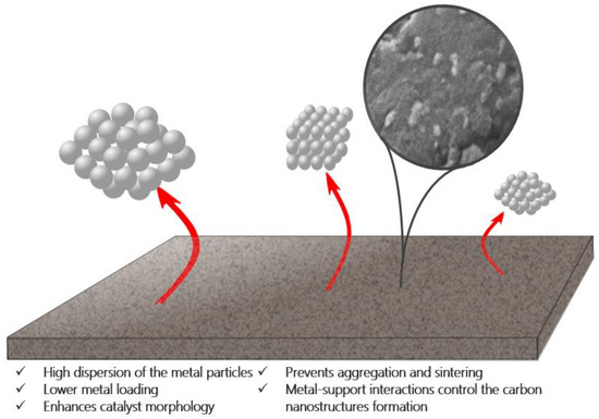 In the cases of bimetallic, trimetallic, or multi-metallic materials, the methane decomposition efficiency and the catalytic durability are increased [28], owing to the synergy of the individual metals. Figure 4 illustrates the interactions between the metallic particles, which modify their structural and electronic arrangements [41], and therefore the active sites and surface areas.