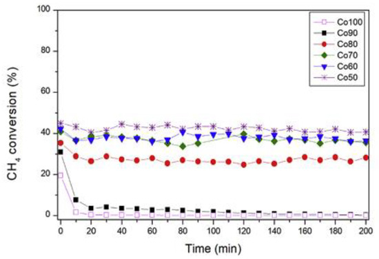 Methane conversion per time plot over Co3-xAlxO4 (x = 0–2) samples at 500 °C. The enhanced dispersion of metal particles leads to boosted performance. Adapted with permission from Ref. [46]. Copyright 2017 Elsevier.