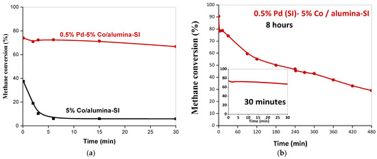 (a) The positive effect of Pd incorporation on Co/alumina activity and stability. The samples were tested at 700 °C for 30 min, under 500 mL/min of 10% CH4/He [88]. (b) Stability test of Pd-Co/alumina at 700 °C for 8 h TOS, under 500 mL/min of 10% CH4/He [89].