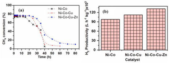 Hu and Jin et al. [92] conducted experiments on bimetallic Ni–Co or Fe–Ni over activated carbon (AC) in order to understand the effects of adding a second metal (Co or Fe) to Ni/AC catalyst. The experiments were conducted at 850 °C for 500 min for the Ni–Co catalysts, and the obtained data show that the introduction of Co to Ni/AC had positive effects on both the catalytic activity and stability. Notably, the increase in cobalt loading (1, 5, 10, 20%) was correlated with a further enhancement in catalytic behavior, since 20%Ni-20%Co/AC demonstrated 30% methane conversion after 430 min TOS, outperforming the monometallic nickel catalyst. The results were attributed to the interaction between Ni and Co particles and to the sufficient mesoporosity of the samples [92]. Another example of catalytic enhancement is the comparison between Ni–Co, Ni–Co–Cu and Ni–Co–Cu–Zn. The spinel phase and the multiple active sites of Ni–Co–Cu–Zn led to high initial methane conversion at 650 °C (initial methane conversion 78%). Moreover, the addition of Zn boosted the metal dispersion, leading to the highest hydrogen productivity and carbon yield [29], as can be inferred from Figure 6.