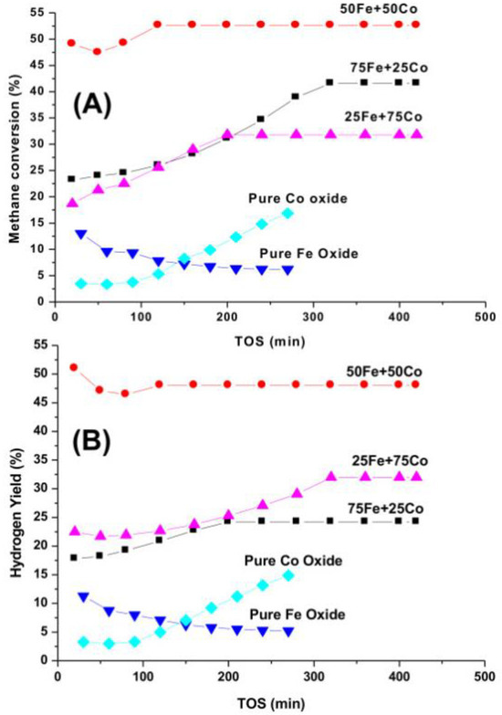 Numerous studies have considered the performance of cobalt ferrite [94,95,96]. Al-Fatesh and Osman et al. [27] compared unsupported 25%Fe–75%Co, 25%Co–75%Fe and 50%Fe–50%Co, in order to determine the effects of different ratios of metals. They concluded that each material displayed the CoFe2O4 spinel structure, and all samples demonstrated stable performance for 425 min. Moreover, the 50%Fe–50%Co sample exhibited the highest hydrogen yield, at approximately 50%, because of the sufficient reduction in all metallic particles during the pre-reduction step [27]. The methane conversion rate and hydrogen yield per time plots of these experiments are displayed in Figure 7.