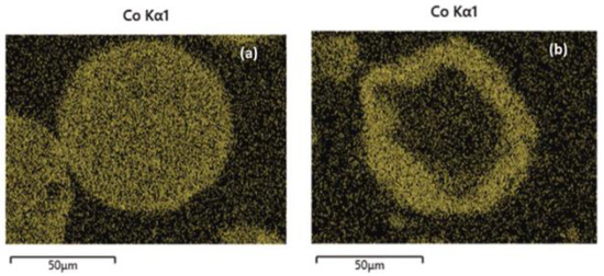 Beside the selection of the most competent materials, the method of synthesis of the catalyst plays an important role in catalyst performance as it modifies the morphology and the dispersion, and hence the availability, of the active sites [49]. Moreover, it influences the reduction of cobalt particles into the active metallic state. Cobalt catalysts are synthesized via various preparation methods, such as precipitation, impregnation, sol-gel, etc. [62,99]. The most inexpensive impregnation method is usually preferred, because of its simplicity [27,83,100] and the high activity of the produced catalytic samples [27,89]. Iliopoulou et al. [89] synthesized 5%Co and 5%Fe catalysts based on alumina support by different impregnation methods (spray impregnation, wet impregnation, dry impregnation). They noticed that the wet impregnation method resulted in the uniform distribution of the metals on alumina, whereas spray impregnation led to core–shell structures, as Figure 8 indicates.