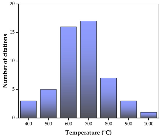 The reaction temperature regimes need to both satisfy the requirements of the endothermic nature of methane pyrolysis and remain at low ranges, below 1000 °C, in order to decrease the operation costs and control the reaction velocity. Figure 9 summarizes the most commonly selected reaction temperatures for cobalt catalysts, which were proven to be the most appropriate values for catalyst activation, hydrogen production acceleration, and valuable carbon structure formation.