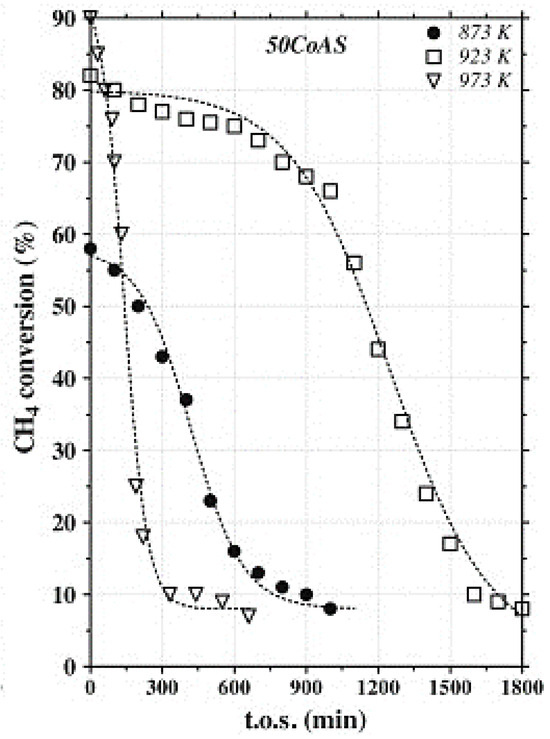 On the other hand, extremely low metal loading implies lower catalyst activity and stability [67,71]. For instance, Fajardo et al. [72] compared the catalytic activities of 2, 6 and 9 wt. % Co on an Al2O3 support, and the results show that the 9 wt. % Co/Al2O3 sample demonstrated the best catalytic activity and stability, because of the higher amount of active sites. Shah et al. [81] synthesized Co catalysts based on a titania–alumina support carrier (25% TiO2) and examined the effect of Cobalt loading (10%, 30%, 50%) on the catalytic performance under 50% CH4/Ar, at 550 °C to 650 °C, for 1 h. They reported that the maximum initial methane conversion was achieved by the material with 50% Co loading at 74% at 600 °C, since it displayed high metal dispersion on the support carrier. This specific material actually exhibited comparable activation energy to Ni-based catalysts (65.16 kJ/mol). The results align with those of a comparative study by Frusteri et al. [66], in which Co samples were based on an alumina–silicate support with different loadings (5, 20, 40, 50%). The authors suggested that the sample with the highest loading achieved 90% methane conversion and durability for 11.6 h at 700 °C. Furthermore, Awadallah et al. [82] used as a base a commercial unsulfided Co-Mo/Al2O3 catalyst with an original nominal Cobalt loading of 3.1%, and introduced Cobalt up to 40% loading via wet impregnation. They tested the samples under natural gas flow (methane 92.48%) at 700 °C up to 9 h. The results indicate that the increase in Cobalt content to 20, 30 or 40% increased the hydrogen yield to 89%. The authors commented that despite the high Co loadings, the samples did not exhibit sintering [82].