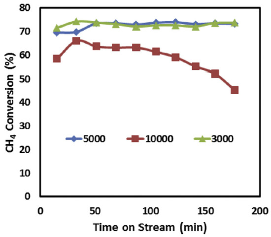 Another considerable factor is Gas Hourly Space Velocity. A high GHSV decreases the residence time, so the contact time between methane and the catalyst surface is limited. As a result, the catalytic methane decomposition is carried out with less efficiency, while solid carbon is deposited at rapid rates, accelerating the catalyst deactivation [40]. According to Khan and Naeem et al. [93], the increase in the GHSV value negatively affects the catalyst activity, because of the decreased contact time between the catalyst surface and the feed gas. They actually compared the GHSV values of 3000 mL/h gcat, 5000 mL/h gcat and 10,000 mL/h gcat, and concluded that the best results corresponded to 5000 mL/h gcat, as can be seen in Figure 11.