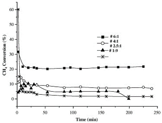 Effects of different #N2:CH4 molar ratios on methane conversion rates over Co–alumina. Reprinted with permission from Ref. [72]. Copyright 2008 Elsevier.