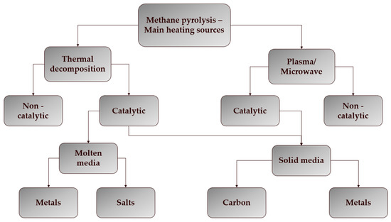 Methane pyrolysis can be categorized into thermal, plasma or microwave, depending on the energy source that is provided in order to break the strong C–H bond [21,24,25,50], as is demonstrated in Figure 13.