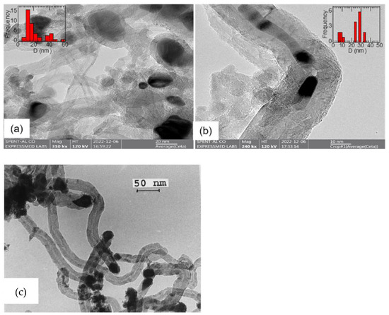 For example, Alharthi et al. [77] compared the performances of impregnated CoFe2O4 on SiO2 and H-ZSM-5 supports. The experimental procedure was conducted at 800 °C for 300 min, and the results indicate that the SiO2 underwent sintering, which caused diffusion difficulties. On the other hand, H-ZSM-5 led to the good dispersion of CoFe2O4 particles, which eventually enhanced the activity and stability of the catalyst. More specifically, the methane decomposition rates gradually increased to 37.35% and remained steady for 300 min TOS. The results were compared to the data obtained by testing unsupported CoFe2O4, which required an extended induction period (180 min); thus, the use of H-ZSM-5 support activated the CoFe2O4’s performance [78], confirming the overall positive effect of support utilization.