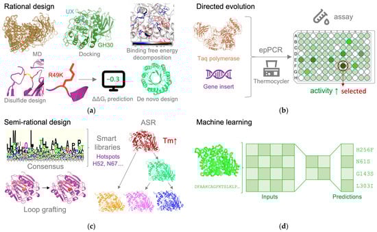 | Single-point mutations | Selective single point mutations with energetically favorable residues (minimizing ), residues important for substrate binding (surface electrostatics/hydrophobicity) or enhancing activity. | activity ↑↓** affinity ↑↓ stability ↑↓ | RD, SRD, DE, ML * | [4,12,21,106,111] |