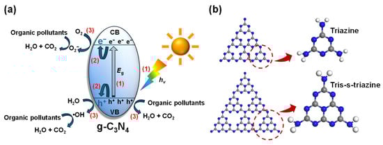 Among various types of photocatalysts, graphitic carbon nitride (g-C3N4), a non-metallic semiconductor, has received significant interest globally. As shown in Figure 1b, triazine (C3N3) rings and tri-s-triazine (C6N7) rings are the basic structural units of g-C3N4. The latter is the most stable phase, making it the typical structural unit that forms g-C3N4. Due to its suitable bandgap (ca. 2.7 eV) and favorable band position, g-C3N4 exhibits high visible light responsiveness. It also offers a range of benefits, such as low cost, excellent stability, and environmental friendliness, making it a promising non-metallic semiconductor photocatalyst [13,14].