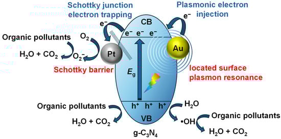 Metal doping incorporates metals into the structure of g-C3N4, whereas metal deposition places metals onto the surface of g-C3N4. Figure 3 schematically illustrates metal deposition on g-C3N4. When the metal interfaces with the g-C3N4 surface, owing to the higher Fermi energy (Ef) of the g-C3N4 compared to the metal, photo-generated electrons will migrate from the higher Ef of g-C3N4 to the metal, forming a Schottky barrier [88]. As a result, the structure comprising of g-C3N4 and the metal is referred to as a Schottky junction. Depositing metal onto the surface of g-C3N4 can promote the separation of photo-generated charge carriers and enhance the photocatalytic activity [89,90]. Additionally, the localized surface plasmon resonance (LSPR) effect leads to the plasmonic electron injecting to g-C3N4, extending photocatalyst’s light absorption range [91,92]. Since they can promote photocatalytic reactions, the doped metals are also referred to as cocatalysts. Based on the aforementioned principles, the deposition of noble metals, such as Au [93], Ag [94], Pt [95], and Pd [96], has been widely studied and proven to be an efficient method for enhancing the solar energy utilization capability of g-C3N4. Nevertheless, the high cost and limited availability of noble metals restrict their practical utilization. Consequently, many researchers have explored the deposition of non-noble metals, such as Ni [97], Cu [98], and Bi [99], to strengthen the photocatalytic performance of g-C3N4-based catalysts. The LSPR effect of non- noble metals can also elevate the separation and migration efficiency of electron–hole pairs and expand the absorption range of photocatalysts. However, their free carrier density is significantly lower compared to the noble metals, and their LSPR frequency corresponds to longer wavelength, resulting in lower photocatalytic activity, which limits their further development [100].