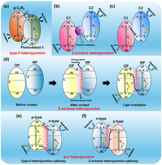 In an isolated g-C3N4 photocatalytic system, photo-generated electrons in the CB are likely to recombine with the holes in the VB, causing electron–hole recombination, which is detrimental to the photocatalytic activity. Hence, the development of g-C3N4-based heterostructures has garnered significant attention for promoting the photocatalytic activity of g-C3N4. These heterostructures can significantly expand the light absorption capacity, increase the SSA, and enhance the density of active sites. Additionally, the incorporation of cocatalysts helps lower the overpotential that is required for catalytic reactions and enhances the separation of photo-generated charge carriers under light excitation. In general, designing and fabricating suitable heterostructures is widely regarded as one of the most effective approaches to improve the efficiency of electron–hole pair separation, yielding a notable increase in photocatalytic activity [12]. Moreover, the introduction of other components, presumably with synergistic interactions, brings several new advantages, including enhanced light absorption capacity, higher surface reactivity, and optimized band positions, all of which benefit the photocatalytic activity. Based on the separation and transfer mechanisms of photo-generated electron–hole pairs, g-C3N4-based heterostructures are grouped into four major types: Type-II heterojunction, Z-scheme heterojunction, S-scheme heterojunction, and p-n heterojunction.