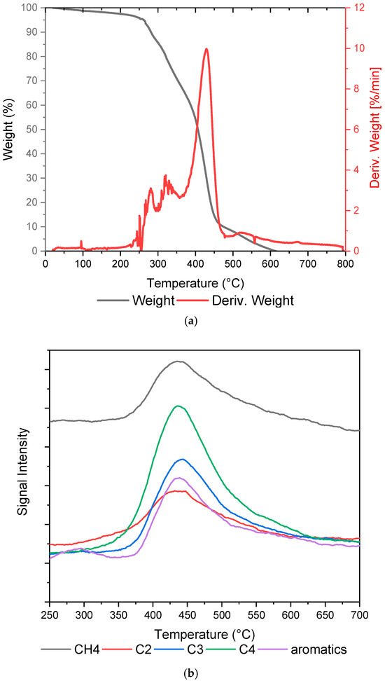 As reported by different papers, the composition of plastic solid waste is complex, and also contains paper waste [26], which is derived from poor collecting and recycling management, or from the nature of the plastic packaging (many products use a combination of paper and plastic in their packaging) whose components are difficult to separate and recycle. The plastic waste sample, mainly constituted of PE and PP with a fraction of paper waste, has been characterized using thermogravimetric analysis coupled with mass spectrometry in order to evaluate the temperature range at which the plastics experience weight loss under pyrolysis conditions. The results of the TGA are reported in Figure 2a. The analysis in an inert atmosphere has shown that under pyrolysis conditions, the plastics degradation occurs in the range of 120–600 °C with a maximum weight loss at 430 °C, corresponding to the pyrolysis of 90% of the sample. No ash content is displayed at the end of the analysis. The results are coherent with the characterization made by Xuan et al. [27], who reported the peak temperatures for PE and PP at 450 °C and 430 °C, respectively. Among the gases generated from the degradation, methane, as well as hydrocarbons with two, three, and four carbon atoms (C2–C4) and aromatics, were observed, as reported in Figure 2b, which shows the intensity of the signals revealed by mass spectrometry coupled with the thermal balance.