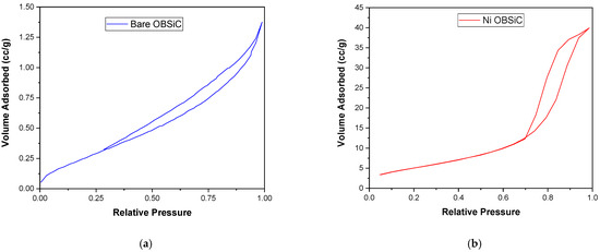 Figure 4a,b show the isotherms resulting from the N2 physisorption tests on the bare and Ni-catalyzed OBSiC foams. According to the IUPAC classification, these isotherms are IV(a) type ones, which are typical of mesoporous materials, with a hysteresis of type H2b indicative of pore-blocking affected desorption [28,29]. When comparing the shapes and intensity of the two curves, it is evident that the catalyzed foam not only has an increased mesoporous structure and pore volume (which goes from 0.002 mL∙g−1 for the bare foam to 0.062 mL∙g−1 for the catalyzed one), but also an increased microporous fraction as the height of the curve at lower values of relative P/P0 increases from 0.1 to 3.4 cc∙g−1. Moreover, the BET method has been used for the evaluation of the Specific Superficial Area (SSA), which ranges from 0.8 to 21.5 m2∙g−1 for the bare and final catalytic foam, respectively. This significant increase highlights the positive impact of the deposition of active phases, which was found to be homogeneously distributed on the surface of the carrier, as illustrated in Figure 5, which also shows the results of the SEM-EXD analysis.