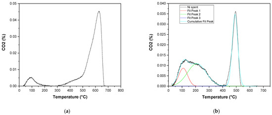 Table 1 summarizes the results of the CO2-TPD in terms of the maximum temperature of each deconvoluted peak and its integrated area (μmol∙g−1 CO2 per gram of sample) as well as the total basicity. These results clearly indicate the decreased ability of the spent catalyst to adsorb CO2 on its surface at high temperatures, while an enhanced capacity to interact with the catalyst surface at lower temperatures. The fresh catalyst is able to adsorb CO2 on strong basic sites at elevated temperatures and can lead to higher reaction rates and prevent carbon deposition.