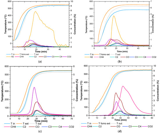 The composition of the gaseous stream produced when the plastic waste is heated in an inert atmosphere (pyrolysis) is reported in Figure 8a. First, the gases released from the solid matrix are hydrogen and carbon dioxide, beginning at approximately 200 °C. As the temperature rises, carbon monoxide, methane, and hydrocarbons containing 2 (C2), 3 (C3), and 4 (C4) carbon atoms are subsequently emitted. The decomposition of the solid mainly generates hydrogen, which can facilitate the hydrogenation of heavy hydrocarbons into short-chain gases, such as methane.