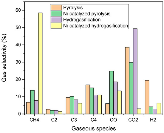 As shown in Figure 9, methane selectivity reached approximately 59% in the case of Ni-catalyzed hydrogasification, a significantly higher value compared to the other tests (6.7% for pyrolysis, 13.7% for catalyzed pyrolysis, and 7.8% for non-catalytic hydrogasification). These findings highlight the crucial role of the catalyst in steering the reaction pathway, as CO2 remains the dominant product in both non-catalytic pyrolysis and hydrogasification.
