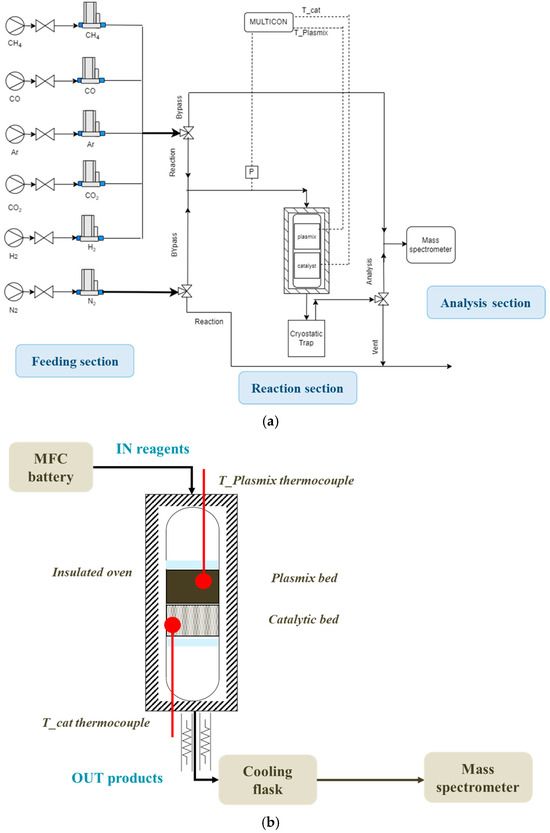 The experimental plant used for testing the catalysts is reported in Figure 12a and has three different sections.