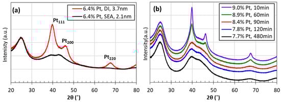 X-Ray diffraction patterns of (a) 6.4 wt% Pt/C catalysts prepared using SEA and DI. (b) ED-made catalysts.