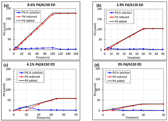 ED kinetic deposition profiles using N2H4/EN/[Pd(NH3)4]2+ = 5/1/1, (a) 8.6 wt% Pd/A150, (b) 5.9 wt% Pd/A150, (c) 4.1 wt% Pd/A150, and (d) 3 wt% Pd/A150. All ED samples were prepared using an SEA-made 1.75 wt% Pd/Aerosil 150 seed catalyst.