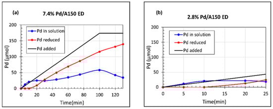 ED kinetic deposition profiles using N2H4/EN/[Pd(NH3)4]2+ = 5/2/1, (a) 7.4 wt% Pd/A150, (b) 2.8 wt% Pd/A150. All ED samples were prepared using an SEA-made 1.88 wt% Pd/Aerosil 150 seed catalyst.