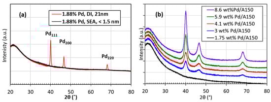 Figure 7a shows the XRD pattern of the SEA-made 1.88 wt% Pd/A150 seed catalyst, along with a dry impregnation (DI) sample with the same loading and reduction treatment. The lack of well-defined peaks for the SEA sample, despite being detectable at the same loading in the DI catalyst, which have 21 nm particles based on the Scherrer formula, signify that Pd particles from SEA are smaller than the detection limit of the instrument (<1.5 nm) [36]. Figure 7b displays the XRD patterns of ED-prepared Pd/A150 samples made from a 1.75 wt% Pd/A150 SEA seed catalyst using the ED bath composition of N2H4/EN/[Pd(NH3)4]2+ = 5/1/1. The sharper peaks as the Pd weight loadings increased indicate the growing crystallite sizes.
