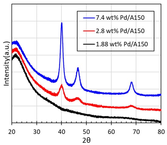 The XRD patterns of the ED-synthesized 2.8 wt%, 7.4 wt% Pd/A150, and seed catalyst are displayed in Figure 9. The lack of well-defined Pd peaks for the SEA-made seed catalyst again indicate very small particle sizes, below the detection limit of the instrument. The stronger peak intensity and sharper peaks for ED-synthesized Pd/A150 as the metal loading increased indicated the growth of Pd particles.
