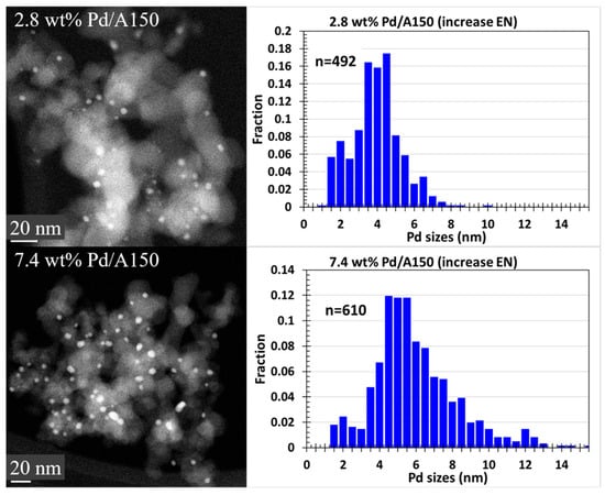 Comparing the Pd particle size estimates via XRD, chemisorption, and STEM, samples with similar loadings prepared with N2H4/EN/[Pd(NH3)4]2+ = 5/2/1 had smaller average particle sizes and a narrower size distribution than samples prepared with N2H4/EN/[Pd(NH3)4]2+ = 5/1/1. STEM images demonstrate that Pd particle sizes were more uniform with samples prepared with an increased EN, also evident in the STEM histograms showing a tighter distribution of particle sizes. To highlight this as an example, 2.8 wt% Pd/A150 prepared with an increased EN had a STEM volume average diameter of 5.1 ± 1.9 nm, while that of 3 wt% Pd/A150 prepared with N2H4/EN/[Pd(NH3)4]2+ = 5/1/1 was 7.2 ± 3.1 nm. XRD and chemisorption results also concur with this observation for the same catalysts. By adding more EN stabilizer to the Pd ED bath, successful enhancement of Pd ED bath stability was achieved, which slowed down the Pd-deposition rate. With a slower Pd-deposition rate, Pd particles grew more uniformly, also resulting in a smaller average particle size. It should also be noted that some Pd particles did not grow after ED in this series, which may be due to EN or chloride interference in the deposition process or the possible restriction of particles in support pores.