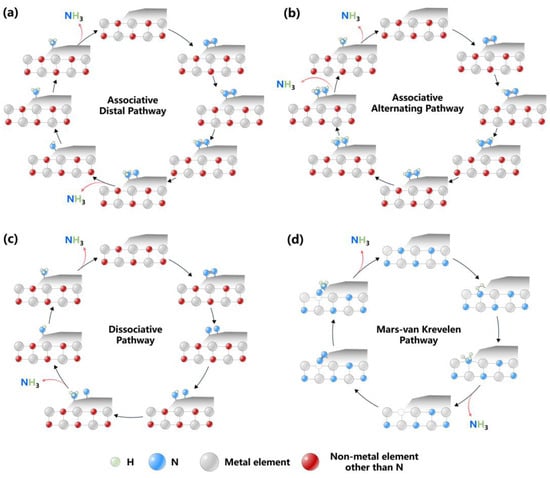 The core challenge of NH3 synthesis is how to effectively activate N2 and achieve efficient conversion. At present, the NH3 synthesis mechanisms proposed in the field of heterogeneous catalysis mainly include associative (Figure 1a,b), dissociative (Figure 1c) and Mars van Krevelen (MvK) mechanisms (Figure 1d) [,,].