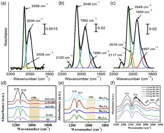 CO-DRIFT spectra of (a) Ru/PrOx, (b) Ru-Cs/PrOx and (c) Ru-Ba-Cs/PrOx. Reproduced with permission from ref. [], under the license of CC BY 4.0. CO-DRIFT spectra of (d) Ru-M/HZ, (e) RuxLay/HZ catalysts of different Ru/La molar ratios and (f) the as-synthesized Ru samples. Reproduced with permission from ref. [], copyright 2021 Elsevier Ltd.