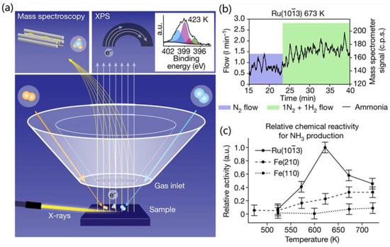 Although NAP-XPS is already a huge step forward to the reaction condition of NH3 synthesis, the gap between NAP and a real reaction condition is still large. Goodwin and colleagues developed an innovative in situ XPS system capable of mimicking pressurized conditions to study the surface valence states of Fe and Ru catalysts during ammonia synthesis []. Figure 4a demonstrates how the system simultaneously measured reaction rates via mass spectrometry while analyzing the electronic structure evolution of catalysts using XPS with total pressure up to 1 bar. The inset in Figure 4a presents the N 1s spectrum of the Fe (110) surface under the reaction condition of 423 K and 200 mbar (N2:H2 = 3:1). The deconvoluted peaks were assigned to NH3 * (blue), NH2* (purple), NH* (red), surface nitrogen species (green) and N2 * (yellow). To monitor NH3 production, the mass spectrometer monitored the concentration evolutions of m/z = 15 and 16, as illustrated in Figure 1b. Chemical reactions, shown in Figure 1c, were characterized by comparing the NH3 signal against those of other components using mass spectrometry. This approach allows the calculation of NH3 production rates at surface sites, normalized to the maximum activity observed under different temperatures. It was found that reaction rates increased with temperature, and the step-edged Fe (210) surface exhibited greater catalytic activity than the flat Fe (110) surface, consistent with previous findings from high-pressure reactor studies. As expected, Ru displayed higher surface activity than Fe. Interestingly, for Ru, the maximum reaction rate was observed at 623 K, rather than at the highest tested temperature of 723 K.