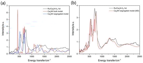 INS spectra of Ru/Ca2N in H2 at 350 °C in the first cycle (black) and the comparison with simulated spectra derived from (a) bulk, segregated and (b) molecular dynamics models Reproduced with permission from ref. []. Copyright 2023 American Chemical Society.
