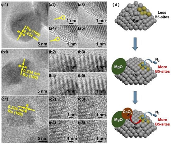 Hansen et al. [] studied the structural evolution of the Ru/Ba/BN catalyst under a reaction atmosphere and temperature with the in situ ETEM. It was found that an amorphous coating on the surface of Ru NPs was formed under the reaction atmosphere, but the structure and morphology of Ru NPs did not change. These results showed that the total number of active sites on the surface did not change regardless of the enhancement of catalytic activity. Ba was found highly mobile and existing in the form of oxides via ETEM, with atomic resolution and electron energy loss spectroscopy (EELS) characterization. Ward et al. [] investigated the dynamic structures of Ru NPs on carbon supports in ammonia synthesis conditions with the in situ ETEM. It was found that the Ru sintering phenomenon was size-dependent. After 1 h reduction in H2 gas at 450 °C, the size of Ru NPs mainly fell into the range of ~1 nm to ~2.5 nm. After treatment at a reaction atmosphere at 300 °C for 2 h and 450 °C for 1 h, the Ru NPs migrated and sintered. Larger, multifaceted Ru NPs were formed while Ru NPs smaller than a certain size tended to remain unchanged. Ding et al. [] studied the effects of catalyst promoters on the behaviors of Ru catalysts under simulated ammonia synthesis temperature and atmosphere by in situ ETEM. The images of Ru/MS, MgO-Ru/MS and Cs@MgO-Ru/MS at different reaction times are shown in Figure 7. The structure of Ru before treatment in the reaction atmosphere and temperature is shown in Figure 7(a1–c1). The Ru/MS structural evolution in a simulated reaction condition is shown in Figure 7(a2–a5). As presented in Figure 7(a2), the crystal plane d-spacing expanded and the structure of Ru evolved to amorphous, and Ru atoms even showed a tendency to detangle from the particle surface. The surface of Ru NPs alternated between amorphous and crystalline states at a longer time-scale, as shown in Figure 7(a3–a5), indicating that Ru NPs were prone to surface reconstruction under reaction conditions. The dynamic behavior of Ru NPs changed after adding MgO promoters (Figure 7(b2–b5)). The Ru atoms at the edge and step sites were very stable and the lattice d-spacing remained unchanged, which was attributed to metal oxide interaction. The catalyst activity of ammonia synthesis might be enhanced by the strong interaction between Ru and metal oxide, which restricted the surface reconstruction of Ru NPs. As a result, the B5 active sites could be well preserved under reaction conditions.