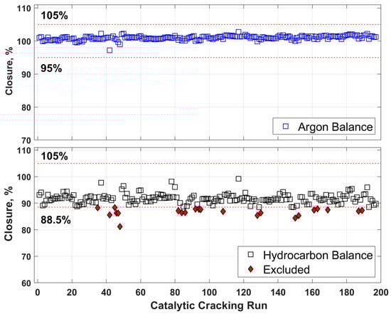 The mass balances for the catalytic cracking runs of VGO yielded the following results: (a) an argon balance of 101% ± 0.6% and (b) a hydrocarbon balance of 91.2% ± 2.4%. Runs with a hydrocarbon mass balance below 88.5% were excluded from the analysis, as shown in Figure 1. This accounted for only 11% of the total catalytic cracking runs conducted in the CREC Riser Simulator. Consequently, 175 out of the original 197 experimental runs were considered valid and were included in this study.
