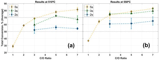 Average VGO conversion results at (a) 510 °C and (b) 550 °C.