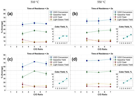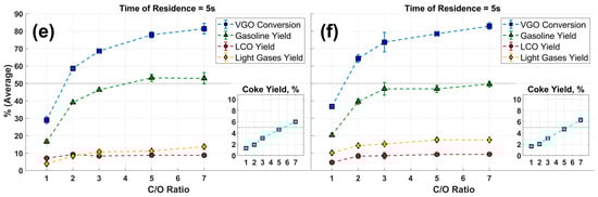 A greater C/O ratio increases the number of catalyst sites available for the cracking reactions, leading to enhanced secondary cracking and coke formation. As shown in Figure 3, this general trend is observed at both 510 °C and 550 °C, where coke yield increases with rising C/O ratios at various reaction times; with temperature increase having a minor effect on coke yield, with this being justified by the small, anticipated activation energy required for coke condensation reactions [16]. However, a deviation from this trend is noted at a reaction time of 2 s at 510 °C, which may be attributed to experimental data variability.