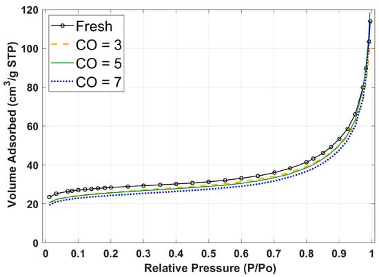 Figure 5 reports the nitrogen adsorption isotherms for the fresh FCC catalyst sample and the three coked FCC catalyst samples. As expected, the volume of N2 adsorbed by the fresh FCC catalyst sample was the highest, as the catalyst was free of coke deposition, allowing for greater access to its pore structure. In contrast, the coked FCC catalyst samples showed progressively lower N2 adsorption volumes due to pore blockage by the coke, which increased with higher C/O ratios.