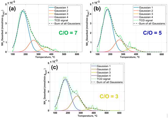 The quantifications of the relative site acidities and site acidity strengths were conducted using a gaussian peak deconvolution method, as described in Section 4.2. As displayed in Figure 9, the deconvoluted NH3–TPD signals for C/O = 7, C/O = 5, and C/O = 3 showed three distinctive gaussian peaks assigned to the weak, medium, and strong acid sites, with a smaller influence of the strong and very strong peaks. In this case, the four peaks observed for the fresh catalyst sample (Figure 7) were reduced to three, with the very strong acidity peak vanishing for the coked FCC catalyst samples. This behavior aligns with the fact that the very strong acid sites have been deactivated by coke deposition. On this basis, one can argue that during catalytic cracking, there is a more dominant influence of the weak–mild acid sites, while the strong and very strong acid sites are occupied by coke, thereby affecting the catalyst’s performance and product selectivity.
