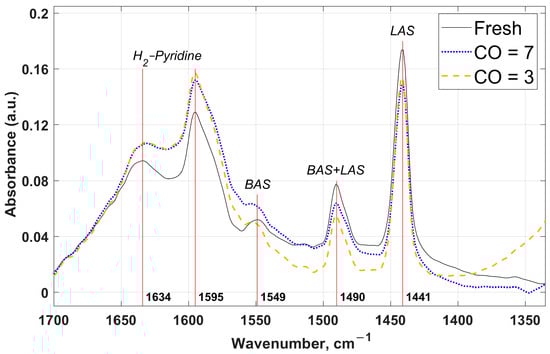 From the pyridine desorption FTIR results (Figure 10), four characteristic IR bands of interest were identified. These four IR bands were attributed to specific acid sites and interactions as follows: (a) the two bands observed in the spectral band between 1650 cm−1 and 1580 cm−1 were assigned to hydrogen-bonded pyridine [9]; (b) the 1549 cm−1 and 1441 cm−1 bands were assigned to BAS and LAS, respectively [19]; and (c) the 1490 cm−1 peak was assigned to a combined LAS and BAS band.
