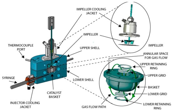 The CREC Riser Simulator reactor contains an annular space between the outer portion of the basket and the inner walls of the lower shell. This design enables the recirculation of gaseous chemical species within the reactor through the rotation of an impeller that is located above the catalyst basket. As the impeller rotates, it generates a low-pressure region at the center of the impeller, providing a driving force to the gaseous species to flow upward through the catalyst basket [25]. As the gas enters the basket, it mixes with the catalyst via a “tornado effect”, fluidizing it and enhancing in this manner the contact between the gas and solid catalyst particles. Furthermore, the CREC Riser Simulator emulates ‘ideal riser’ or ‘ideal downer’ conditions, with the gas chemical species and the catalyst particles exhibiting identical reaction times. These identical reaction times of both gas and catalyst are equivalent to those of a riser or a downer unit with no slip velocity between the gas and particle velocities. This approximation holds true, as the velocities of catalyst particles and gas phases in downer and riser reactors typically differ by only about 5–10% [24].