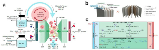 - Zhang, G.; Li, B.; Shi, Y.; Zhou, Q.; Fu, W.-J.; Zhou, G.; Ma, J.; Yin, S.; Yuan, W.; Miao, S. Ammonia recovery from nitrate-rich wastewater using a membrane-free electrochemical system. Nat. Sustain. 2024, 7, 1251–1263. [Google Scholar] [CrossRef]
