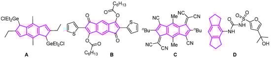Owing to the potential applications in polymers with unique optical and electronic properties, polynuclear transition metal complexes as well as biologically active compounds, molecules with s-indacene as the basic structural core, have captured the attention of the synthetic chemistry community [,]. For instance, bis-organogermanium compound A is used as a functional monomer in polymerization reactions to obtain organometallic materials []. s-indacene 1,5-dione B, having symmetrically substituted thiophene rings, displays thermally induced polymorphic transformations []. A nitrile derivative of s-indacene C possesses a high electron affinity, thus providing a candidate for π-conjugated molecular materials of the s-indacene system []. Sulfonylurea D exhibits prominent cytokine inhibitory activity [] (Figure 1).
